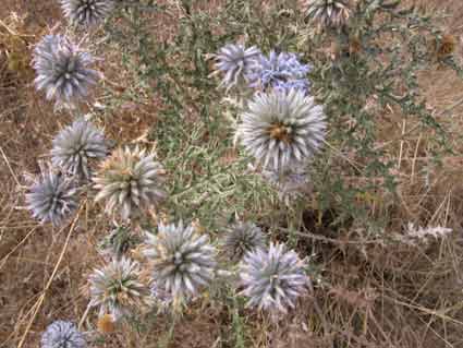 No es siempre azul, en septiembre lo veremos convertido en amarillo, pero ahora podemos descubrirlo en otros colores. Al principio del verano era blanquecino, ahora va azulándose, y en septiembre lo veremos dorado y reseco por el sol. Su nombre es Cardo yesquero o cardo abadejo (siempre cardo), y el científico es "Echinops ritro" o "Echinop sphaerocephala"(una de las dos especies, no llego muy bien a diferenciarlas.. Y como dicen los botánicos: "la planta es aperísima, punzante y hórrida. Aquí, no podemos decir aquello de "eres más feo que un cardo", porque su color y la redondez de sus flores lo hacen atractivo. Incluso hay quien los recoge en esta época (azulados) para secarlos en la sombra, y servir de adorno. |